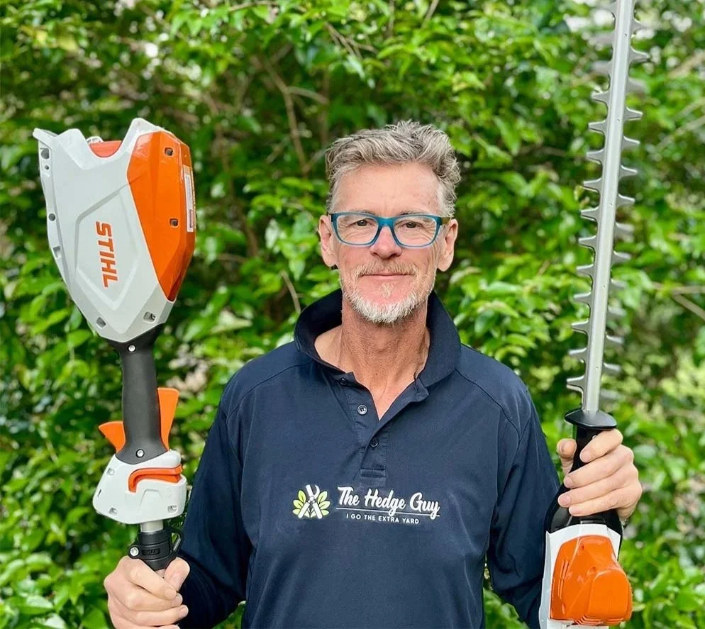 I use only Stihl battery-powered tools as they cut emissions with the professional grade AP System, reduces operator fatigue through lighter, low-vibration design, and operate quietly to minimise noise disturbance for all concerned, especially in dense suburban environments. This blend of eco-friendliness, comfort, and practicality makes Stihl my top choice for professional hedge trimming and landscaping. Oh and they’re fun to use!